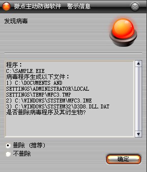 已安装使用微点主动防御软件的用户,无须任何设置,微点主动防御将自动保护您的系统免受该病毒的入侵和破坏。无论您是否已经升级到最新版本,微点主动防御都能够有效清除该病毒。如果您没有将微点主动防御软件升级到最新版,微点主动防御软件在发现该病毒后将报警提示您发现“病毒“,请直接选择删除处理(如图1);