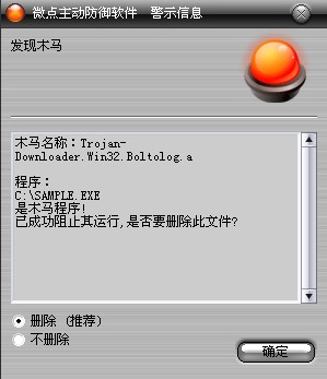 如果您已经将微点主动防御软件升级到最新版本,微点将报警提示您发现木马"Trojan-Downloader.Win32.Boltolog.a”,请直接选择删除(如图2)。
