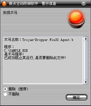 如果您已经将微点主动防御软件升级到最新版本,微点将报警提示您发现木马"Trojan-Dropper.Win32.Agent.b”,请直接选择删除(如图2)。