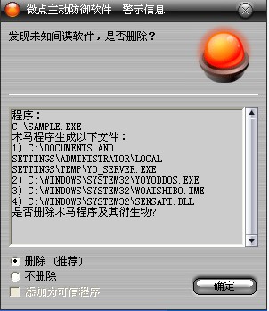 图1 微点主动防御软件自动捕获未知病毒(未升级)