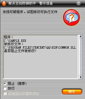 已安装使用微点主动防御软件的用户,无须任何设置,微点主动防御将自动保护您的系统免受该病毒的入侵和破坏。无论您是否已经升级到最新版本,微点主动防御都能够有效清除该病毒。如果您没有将微点主动防御软件升级到最新版,微点主动防御软件在发现该病毒后将报警提示您发现“可疑程序”,请直接选择删除处理(如图1);