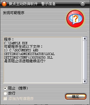 已安装使用微点主动防御软件的用户,无须任何设置,微点主动防御将自动保护您的系统免受该病毒的入侵和破坏。无论您是否已经升级到最新版本,微点主动防御都能够有效清除该病毒。如果您没有将微点主动防御软件升级到最新版,微点主动防御软件在发现该病毒后将报警提示您发现“可疑程序”,请直接选择删除处理(如图1);