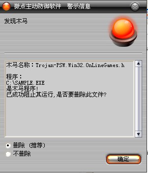 如果您已经将微点主动防御软件升级到最新版本,微点将报警提示您发现木马"Trojan-PSW.Win32.OnLineGames.h”,请直接选择删除(如图2)。