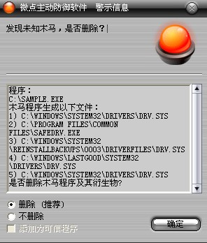 已安装使用微点主动防御软件的用户,无须任何设置,微点主动防御将自动保护您的系统免受该病毒的入侵和破坏。无论您是否已经升级到最新版本,微点主动防御都能够有效清除该病毒。如果您没有将微点主动防御软件升级到最新版,微点主动防御软件在发现该病毒后将报警提示您发现“未知木马”,请直接选择删除处理(如图1);
