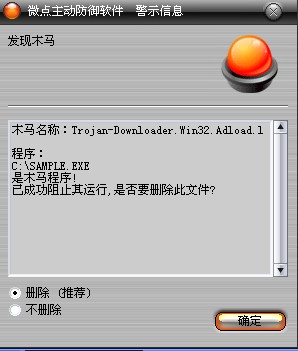 如果您已经将微点主动防御软件升级到最新版本,微点将报警提示您发现木马"Trojan-Downloader.Win32.Adload.l”,请直接选择删除(如图2)。