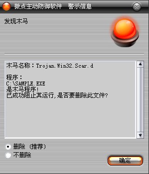 如果您已经将微点主动防御软件升级到最新版本,微点将报警提示您发现木马"Trojan.Win32.Scar.d”,请直接选择删除(如图2)。