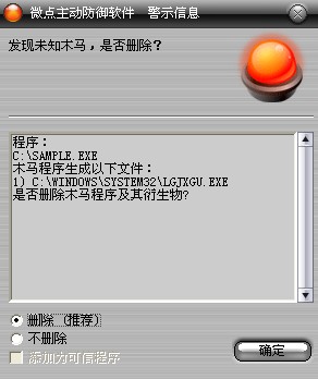 已安装使用微点主动防御软件的用户,无须任何设置,微点主动防御将自动保护您的系统免受该病毒的入侵和破坏。无论您是否已经升级到最新版本,微点主动防御都能够有效清除该病毒。如果您没有将微点主动防御软件升级到最新版,微点主动防御软件在发现该病毒后将报警提示您发现“未知木马”,请直接选择删除处理(如图1);