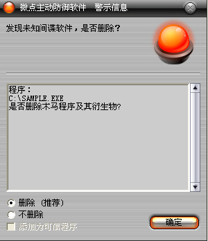 已安装使用微点主动防御软件的用户,无须任何设置,微点主动防御将自动保护您的系统免受该病毒的入侵和破坏。无论您是否已经升级到最新版本,微点主动防御都能够有效清除该病毒。如果您没有将微点主动防御软件升级到最新版,微点主动防御软件在发现该病毒后将报警提示您发现“未知间谍软件”,请直接选择删除处理(如图1);