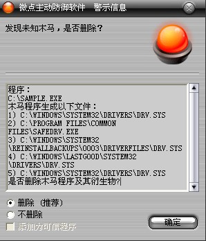 如果您已经将微点主动防御软件升级到最新版本,微点将报警提示您发现木马"Trojan.Win32.Buzus.b”,请直接选择删除(如图2)。