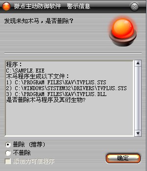 已安装使用微点主动防御软件的用户,无须任何设置,微点主动防御将自动保护您的系统免受该病毒的入侵和破坏。无论您是否已经升级到最新版本,微点主动防御都能够有效清除该病毒。如果您没有将微点主动防御软件升级到最新版,微点主动防御软件在发现该病毒后将报警提示您发现“未知木马”,请直接选择删除处理(如图1);