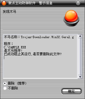 如果您已经将微点主动防御软件升级到最新版本,微点将报警提示您发现木马"Trojan-Downloader.Win32.Geral.g”,请直接选择删除(如图2)。