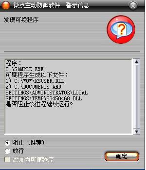 已安装使用微点主动防御软件的用户,无须任何设置,微点主动防御将自动保护您的系统免受该病毒的入侵和破坏。无论您是否已经升级到最新版本,微点主动防御都能够有效清除该病毒。如果您没有将微点主动防御软件升级到最新版,微点主动防御软件在发现该病毒后将报警提示您发现“可疑程序”,请直接选择删除处理(如图1);