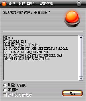 如果您已经将微点主动防御软件升级到最新版本,微点将报警提示您发现木马"Trojan-Dropper.Win32.Microjoin.a”,请直接选择删除(如图2)。