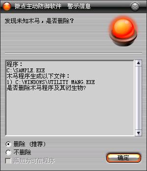 已安装使用微点主动防御软件的用户,无须任何设置,微点主动防御将自动保护您的系统免受该病毒的入侵和破坏。无论您是否已经升级到最新版本,微点主动防御都能够有效清除该病毒。如果您没有将微点主动防御软件升级到最新版,微点主动防御软件在发现该病毒后将报警提示您发现“未知木马”,请直接选择删除处理(如图1);