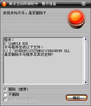 已安装使用微点主动防御软件的用户,无须任何设置,微点主动防御将自动保护您的系统免受该病毒的入侵和破坏。无论您是否已经升级到最新版本,微点主动防御都能够有效清除该病毒。如果您没有将微点主动防御软件升级到最新版,微点主动防御软件在发现该病毒后将报警提示您发现“未知木马”,请直接选择删除处理(如图1);
