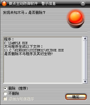 已安装使用微点主动防御软件的用户,无须任何设置,微点主动防御将自动保护您的系统免受该病毒的入侵和破坏。无论您是否已经升级到最新版本,微点主动防御都能够有效清除该病毒。如果您没有将微点主动防御软件升级到最新版,微点主动防御软件在发现该病毒后将报警提示您发现“未知木马”,请直接选择删除处理(如图1);