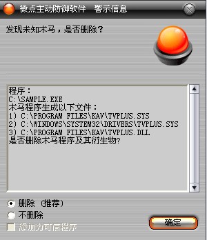 已安装使用微点主动防御软件的用户,无须任何设置,微点主动防御将自动保护您的系统免受该病毒的入侵和破坏。无论您是否已经升级到最新版本,微点主动防御都能够有效清除该病毒。如果您没有将微点主动防御软件升级到最新版,微点主动防御软件在发现该病毒后将报警提示您发现“未知木马”,请直接选择删除处理(如图1);
