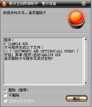 已安装使用微点主动防御软件的用户,无须任何设置,微点主动防御将自动保护您的系统免受该病毒的入侵和破坏。无论您是否已经升级到最新版本,微点主动防御都能够有效清除该病毒。如果您没有将微点主动防御软件升级到最新版,微点主动防御软件在发现该病毒后将报警提示您发现“未知木马”,请直接选择删除处理(如图1);