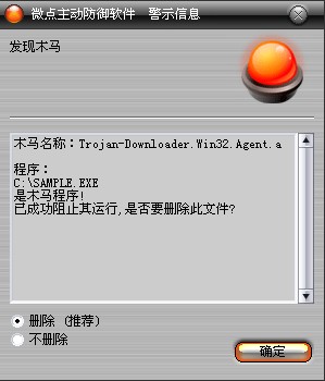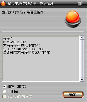 已安装使用微点主动防御软件的用户,无须任何设置,微点主动防御将自动保护您的系统免受该病毒的入侵和破坏。无论您是否已经升级到最新版本,微点主动防御都能够有效清除该病毒。如果您没有将微点主动防御软件升级到最新版,微点主动防御软件在发现该病毒后将报警提示您发现“未知木马”,请直接选择删除处理(如图1);