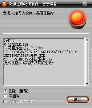 如果您已经将微点主动防御软件升级到最新版本,微点将报警提示您发现木马"Backdoor.Win32.GreyPigeon.a”,请直接选择删除(如图2)。