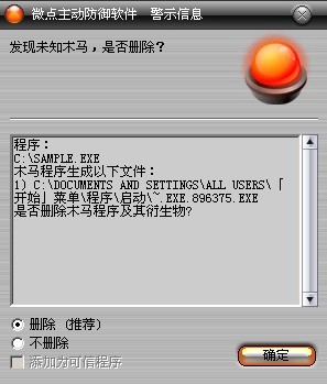 已安装使用微点主动防御软件的用户,无须任何设置,微点主动防御将自动保护您的系统免受该病毒的入侵和破坏。无论您是否已经升级到最新版本,微点主动防御都能够有效清除该病毒。如果您没有将微点主动防御软件升级到最新版,微点主动防御软件在发现该病毒后将报警提示您发现“未知木马”,请直接选择删除处理(如图1);