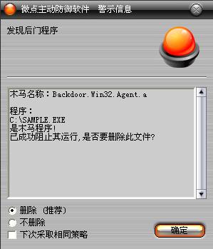 如果您已经将微点主动防御软件升级到最新版本,微点将报警提示您发现木马"Backdoor.Win32.Agent.a ”,请直接选择删除(如图2)。