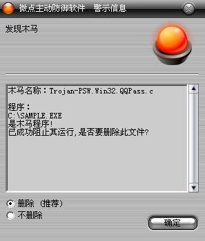 如果您已经将微点主动防御软件升级到最新版本,微点将报警提示您发现木马"Trojan-PSW.Win32.QQPass.c ”,请直接选择删除(如图2)。