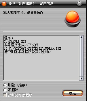 已安装使用微点主动防御软件的用户,无须任何设置,微点主动防御将自动保护您的系统免受该病毒的入侵和破坏。无论您是否已经升级到最新版本,微点主动防御都能够有效清除该病毒。如果您没有将微点主动防御软件升级到最新版,微点主动防御软件在发现该病毒后将报警提示您发现“未知木马”,请直接选择删除处理(如图1);