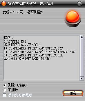 已安装使用微点主动防御软件的用户,无须任何设置,微点主动防御将自动保护您的系统免受该病毒的入侵和破坏。无论您是否已经升级到最新版本,微点主动防御都能够有效清除该病毒。如果您没有将微点主动防御软件升级到最新版,微点主动防御软件在发现该病毒后将报警提示您发现“未知木马”,请直接选择删除处理(如图1);