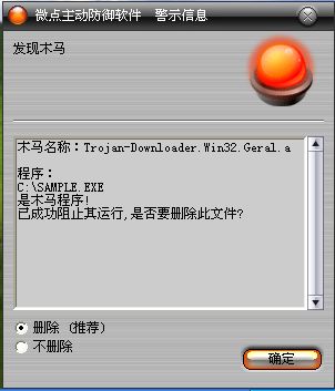 如果您已经将微点主动防御软件升级到最新版本,微点将报警提示您发现木马"Trojan-Downloader.Win32.Geral.a”,请直接选择删除(如图2)。