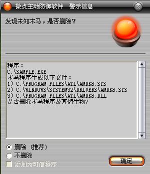 已安装使用微点主动防御软件的用户,无须任何设置,微点主动防御将自动保护您的系统免受该病毒的入侵和破坏。无论您是否已经升级到最新版本,微点主动防御都能够有效清除该病毒。如果您没有将微点主动防御软件升级到最新版,微点主动防御软件在发现该病毒后将报警提示您发现“未知木马”,请直接选择删除处理(如图1);