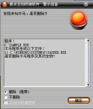 如果您已经将微点主动防御软件升级到最新版本,微点将报警提示您发现木马"Trojan.Win32.Scar.a”,请直接选择删除(如图2)。