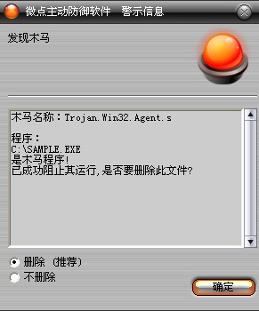 如果您已经将微点主动防御软件升级到最新版本,微点将报警提示您发现木马"Trojan.Win32.Agent.s”,请直接选择删除(如图2)。