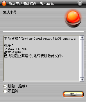 如果您已经将微点主动防御软件升级到最新版本,微点将报警提示您发现木马"Trojan-Downloader.Win32.Agent.g”,请直接选择删除(如图2)。