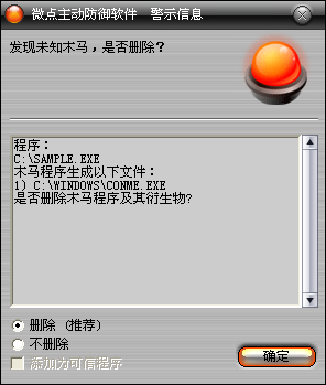 已安装使用微点主动防御软件的用户,无须任何设置,微点主动防御将自动保护您的系统免受该病毒的入侵和破坏。无论您是否已经升级到最新版本,微点主动防御都能够有效清除该病毒。如果您没有将微点主动防御软件升级到最新版,微点主动防御软件在发现该病毒后将报警提示您发现“未知木马”,请直接选择删除处理(如图1)