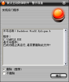 如果您已经将微点主动防御软件升级到最新版本,微点将报警提示您发现木马"Backdoor.Win32.XyLigan.b”,请直接选择删除(如图2)。