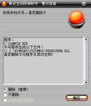 已安装使用微点主动防御软件的用户,无须任何设置,微点主动防御将自动保护您的系统免受该病毒的入侵和破坏。无论您是否已经升级到最新版本,微点主动防御都能够有效清除该病毒。如果您没有将微点主动防御软件升级到最新版,微点主动防御软件在发现该病毒后将报警提示您发现“未知木马”,请直接选择删除处理(如图1)