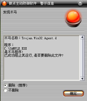 如果您已经将微点主动防御软件升级到最新版本,微点将报警提示您发现木马"Trojan.Win32.Agent.d”,请直接选择删除(如图2)。