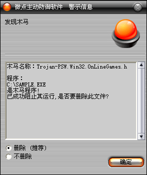 如果您已经将微点主动防御软件升级到最新版本,微点将报警提示您发现木马"Trojan-PSW.Win32.OnLineGames.h”,请直接选择删除(如图2)。