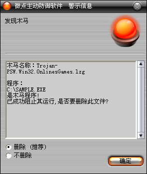 如果您已经将微点主动防御软件升级到最新版本,微点将报警提示您发现木马"Trojan-PSW.Win32.OnLineGames.lzg”,请直接选择删除(如图2)。