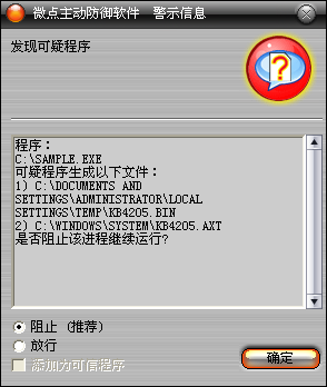 图1 微点主动防御软件自动捕获未知病毒(未升级)