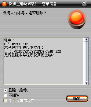 已安装使用微点主动防御软件的用户,无须任何设置,微点主动防御将自动保护您的系统免受该病毒的入侵和破坏。无论您是否已经升级到最新版本,微点主动防御都能够有效清除该病毒。如果您没有将微点主动防御软件升级到最新版,微点主动防御软件在发现该病毒后将报警提示您发现“未知木马”,请直接选择删除处理(如图1)