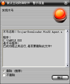 如果您已经将微点主动防御软件升级到最新版本,微点将报警提示您发现木马"Trojan-Downloader.Win32.Agent.a”,请直接选择删除(如图2)。