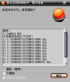 已安装使用微点主动防御软件的用户,无须任何设置,微点主动防御将自动保护您的系统免受该病毒的入侵和破坏。无论您是否已经升级到最新版本,微点主动防御都能够有效清除该病毒。如果您没有将微点主动防御软件升级到最新版,微点主动防御软件在发现该病毒后将报警提示您发现“未知木马”,请直接选择删除处理(如图1)