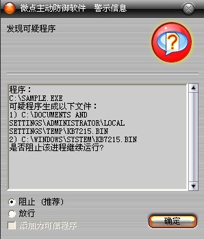已安装使用微点主动防御软件的用户,无须任何设置,微点主动防御将自动保护您的系统免受该病毒的入侵和破坏。无论您是否已经升级到最新版本,微点主动防御都能够有效清除该病毒。如果您没有将微点主动防御软件升级到最新版,微点主动防御软件在发现该病毒后将报警提示您发现“可疑程序”,请直接选择删除处理(如图1)