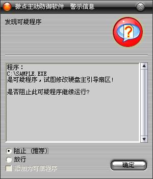 已安装使用微点主动防御软件的用户,无须任何设置,微点主动防御将自动保护您的系统免受该病毒的入侵和破坏。无论您是否已经升级到最新版本,微点主动防御都能够有效清除该病毒。如果您没有将微点主动防御软件升级到最新版,微点主动防御软件在发现该病毒后将报警提示您发现“可疑程序”,请直接选择删除处理(如图1)