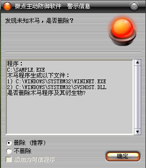 已安装使用微点主动防御软件的用户,无须任何设置,微点主动防御将自动保护您的系统免受该病毒的入侵和破坏。无论您是否已经升级到最新版本,微点主动防御都能够有效清除该病毒。如果您没有将微点主动防御软件升级到最新版,微点主动防御软件在发现该病毒后将报警提示您发现“未知木马”,请直接选择删除处理(如图1)