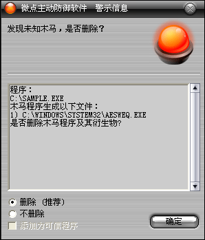 已安装使用微点主动防御软件的用户,无须任何设置,微点主动防御将自动保护您的系统免受该病毒的入侵和破坏。无论您是否已经升级到最新版本,微点主动防御都能够有效清除该病毒。如果您没有将微点主动防御软件升级到最新版,微点主动防御软件在发现该病毒后将报警提示您发现“未知木马”,请直接选择删除处理(如图1)
