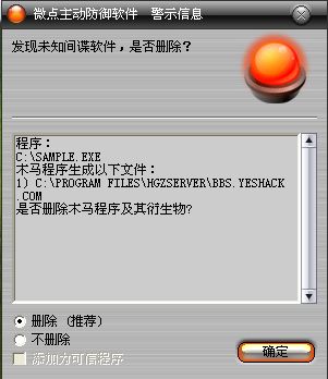 如果您已经将微点主动防御软件升级到最新版本,微点将报警提示您发现木马"Backdoor.Win32.Huigezi.afcz”,请直接选择删除(如图2)。
