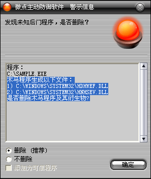 如果您已经将微点主动防御软件升级到最新版本,微点将报警提示您发现木马"Backdoor.Win32.PcClient.a”,请直接选择删除(如图2)。